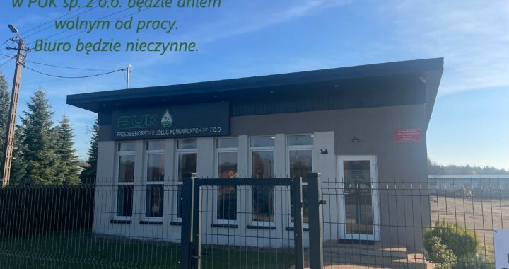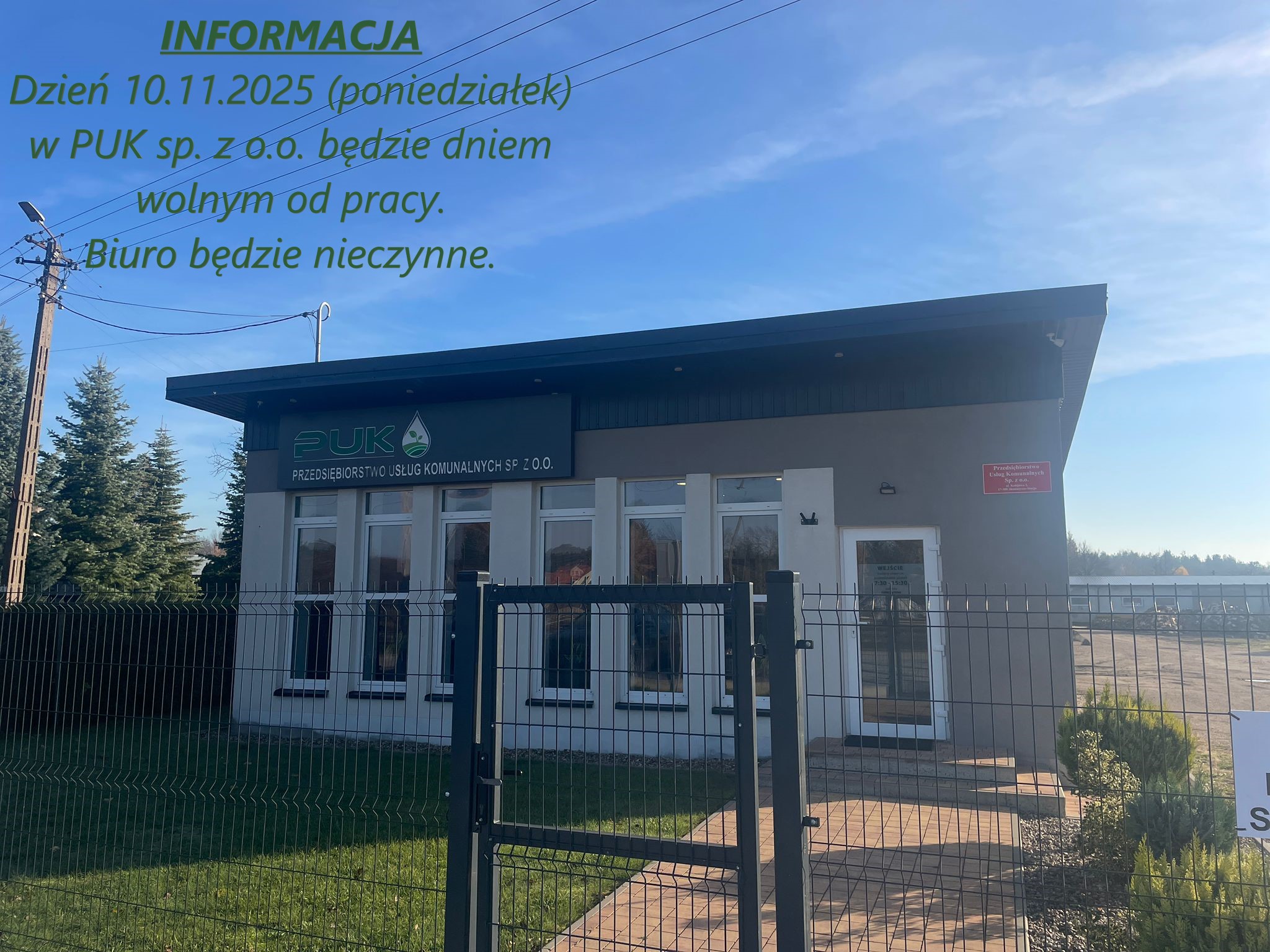 10.11.2025 (poniedziałek) dniem wolnym od pracy INFORMACJA Dzień 10.11.2025 (poniedziałek) będzie dniem wolnym od pracy w PUK sp. z o.o. w Siemiatyczach-Stacji.W tym dniu nasze biuro będzie nieczynne.Zapraszamy w środę 12 listopada.
